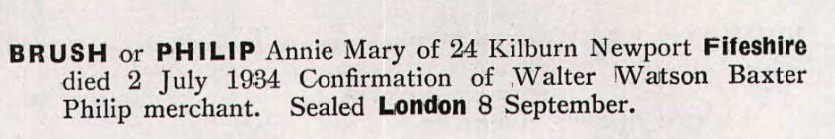 At 1901 they are living in the Forgan RD, Fife. The census index does not indicate any children with them. They are also at Forgan in 1911 with Walter W B PHILIP, age 9. From the Probate record we get his full nmes, Walter Watson Baxter PHILIP. I have not been able to locate them in 1921.