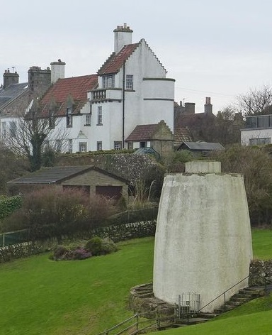 This building was apparently known as 'The Priory'. It was built in or around 1910. Since 1972 it has been a Category B listed Building. The brief listing description is "Thoms and Wilkie c 1910. Scots baronial, picturesque composition. 2-storey, front to sea 3-window 3-storey NE tower with circular turret at N angle." The building is apparently mentioned in a book by John Gifford called "The Buildings of Scotland Fife". A brief quote was included in a now defunct webpage "THE PRIORY, a light-hearted baronial villa by Thoms & Wilkie for Samuel Brush of Dundee, 1915. An odd but effective composition, white-harled and red-tiled, complete with gabled tower and circular turret."