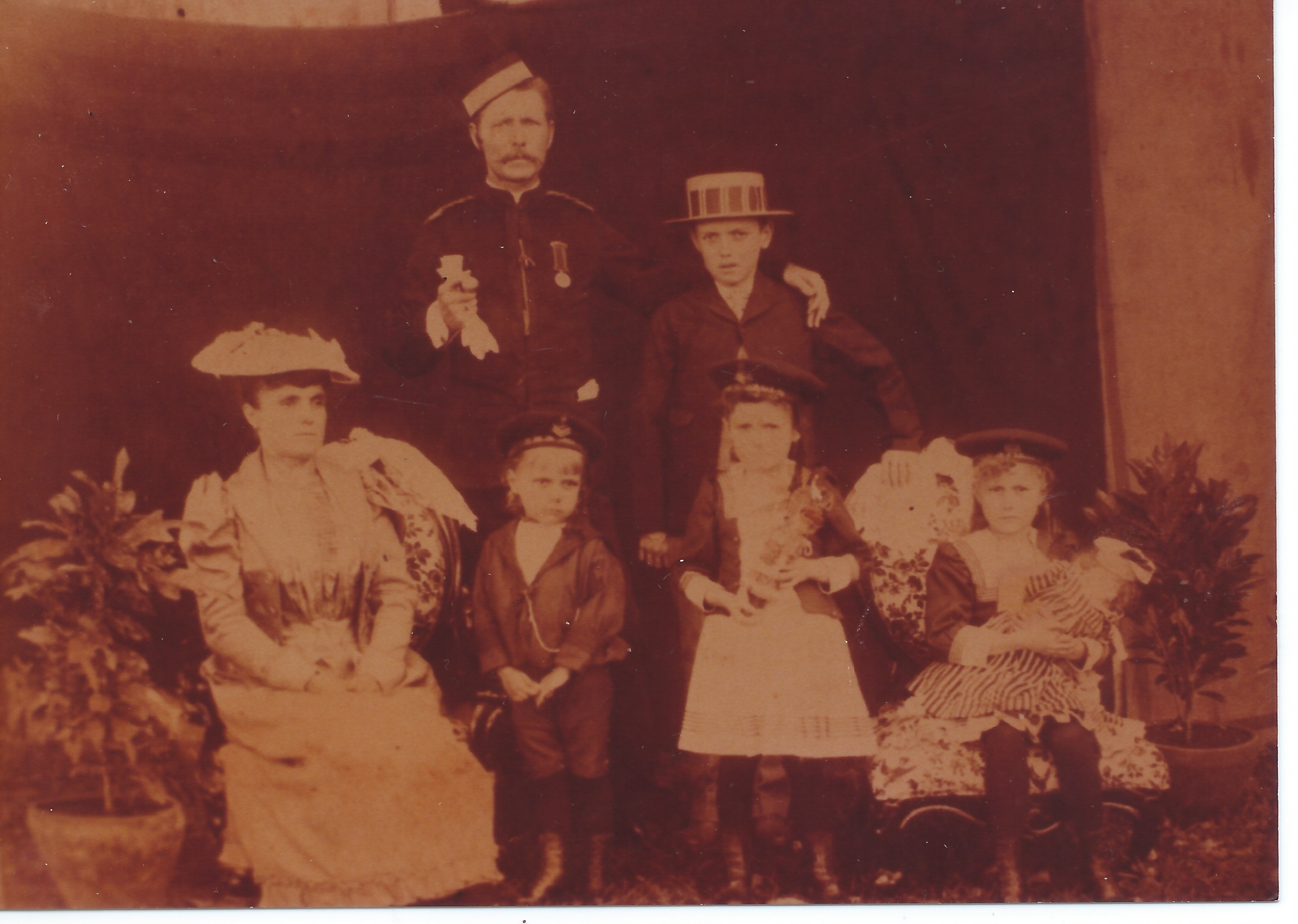 This family photo appears to date from June/July 1903, shortly before Charles left the Army. At this date Denis was 7, Nora was 5, Charles was 4 and Florence was 3. Matching these to the pictured children; Denis looks older than 7 and the seated girl - Nora -looks older than 5. Charles is a good deal shorter and looks younger than his younger sister Florence.