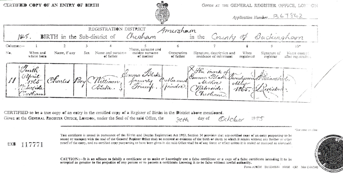 Charles Blake, the emigrant to Australia, was born in the Waterside district of Chesham in Buckinghamshire on 10 April 1865 and within two years moved, with his parents, to Sunbury-on-Thames in Middlesex, sometime before the birth of his sister Emma there in 1867. The stories of Charles's brothers and sisters are in Part 3.